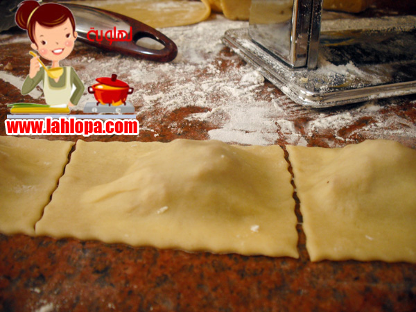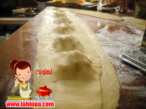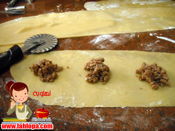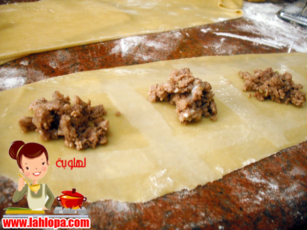 نفرد العجين على شكل مستطيل او مربع كبير تقريبا تبقى سمكها 1سم يوضع مقدار معلقة من اللحمة المعصجة فى خط مستقيم على طول العجين على ان تبعد كل معلقة عن حشو الاخرى بمسافة