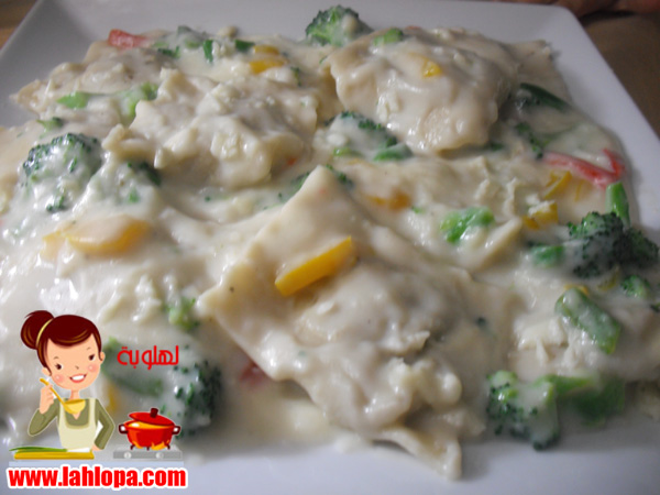 فى طاسة نشوح بصلة مقطعة وفص ثوم مفروم ثم فلفل الوان مقطع مكعبات وبروكلى مقطع ونقلب دقايق ثم نضيف كوب بشاميل خفيف ونضيف ملح وفلفل وبهارات ثم نضيف قطع الرافيولى ونقلب دقيقة ثم يقدم