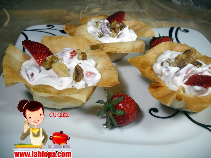 ثم نعمل الكريمة وتخلط بالفراولة المكعبات والمكسرات وتوضع فى كل كب معلقتين من الكريمة وتزين بالفراولة والمكسرات