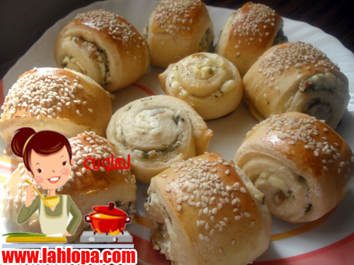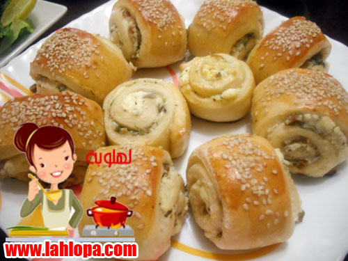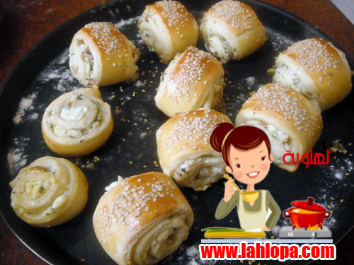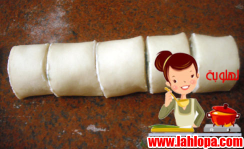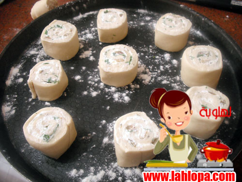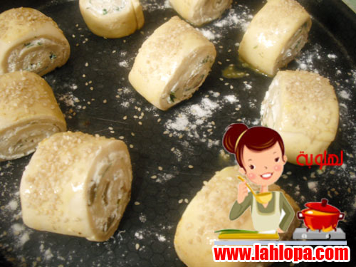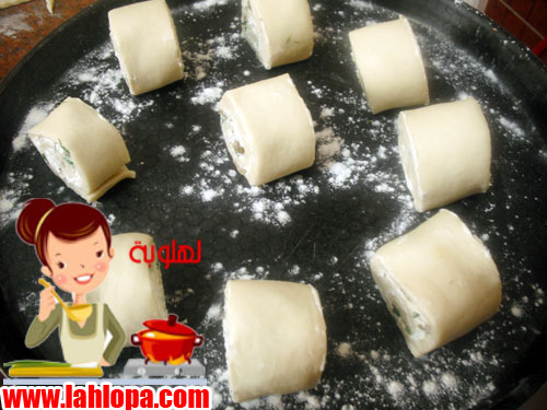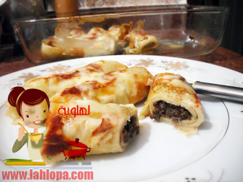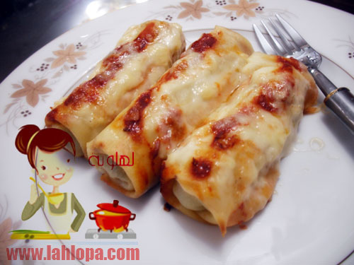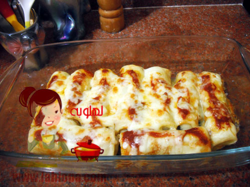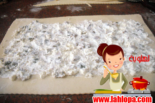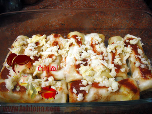 ونضع فوقه قليل من البشاميل ونثنى الاطراف على هذا الحشو ونبرمها بالطول ونرصها فى صينية مدهونة