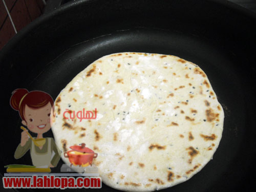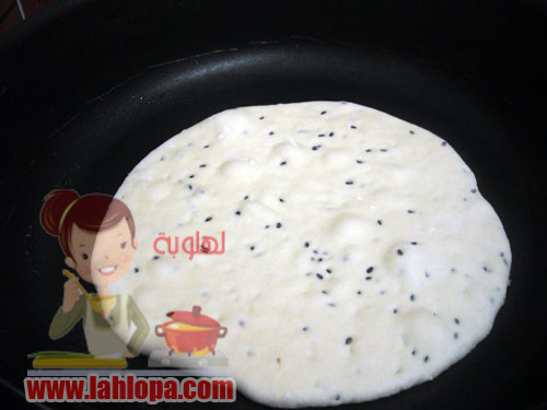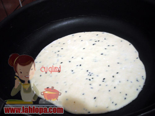 نسخن الطاسة جيدا ثم نأخذ مقدار من العجينة بالكبشة
