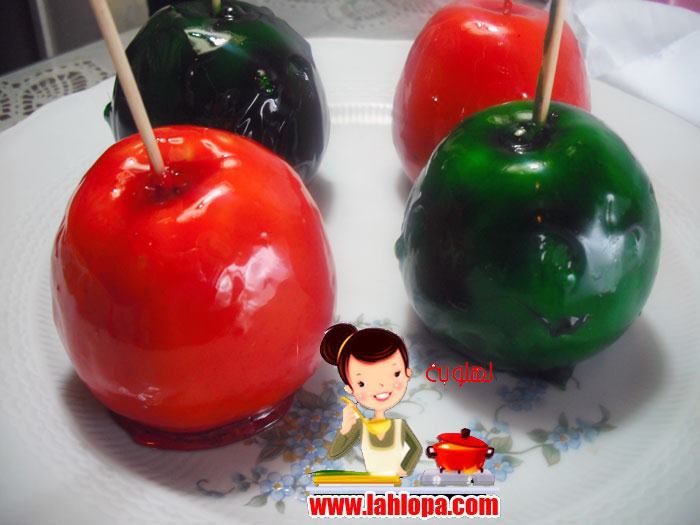 ثم نضع فى كل تفاحة بعد غسلها سيخ شوى خشب ثم تمسك كل تفاحة من السيخ وتلف بالكراميل من كل الجوانب