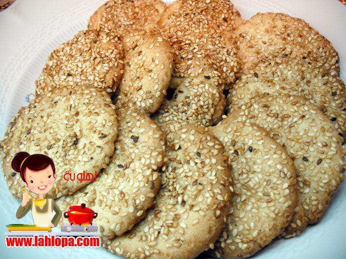 وناخد قطعة صغيرة من العجينة نكورها ثم نضغطها بين راحتى اليد ثم تدهن بالبياض ثم توضع على طبق مفرود فيه السمسم ونضغط عليها حتى يلتصق السمسم بها من الجهتين وتصبح ارق
