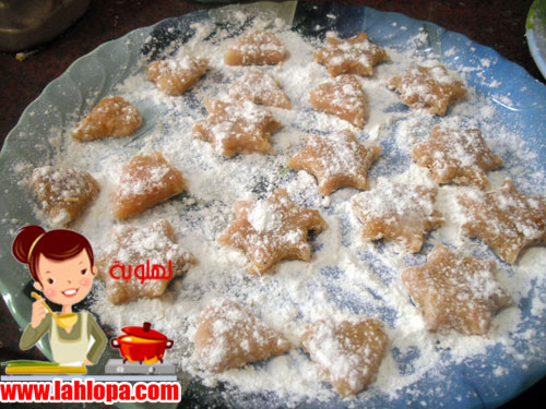 ثم نشكلها باليد كور مثلا او تقطع بالقطاعات مع وضعها فى الدقيق اولا عشان ماتلزقش وتوضع على صينية مرشوشة دقيق ونرش عليها دقيق من فوق